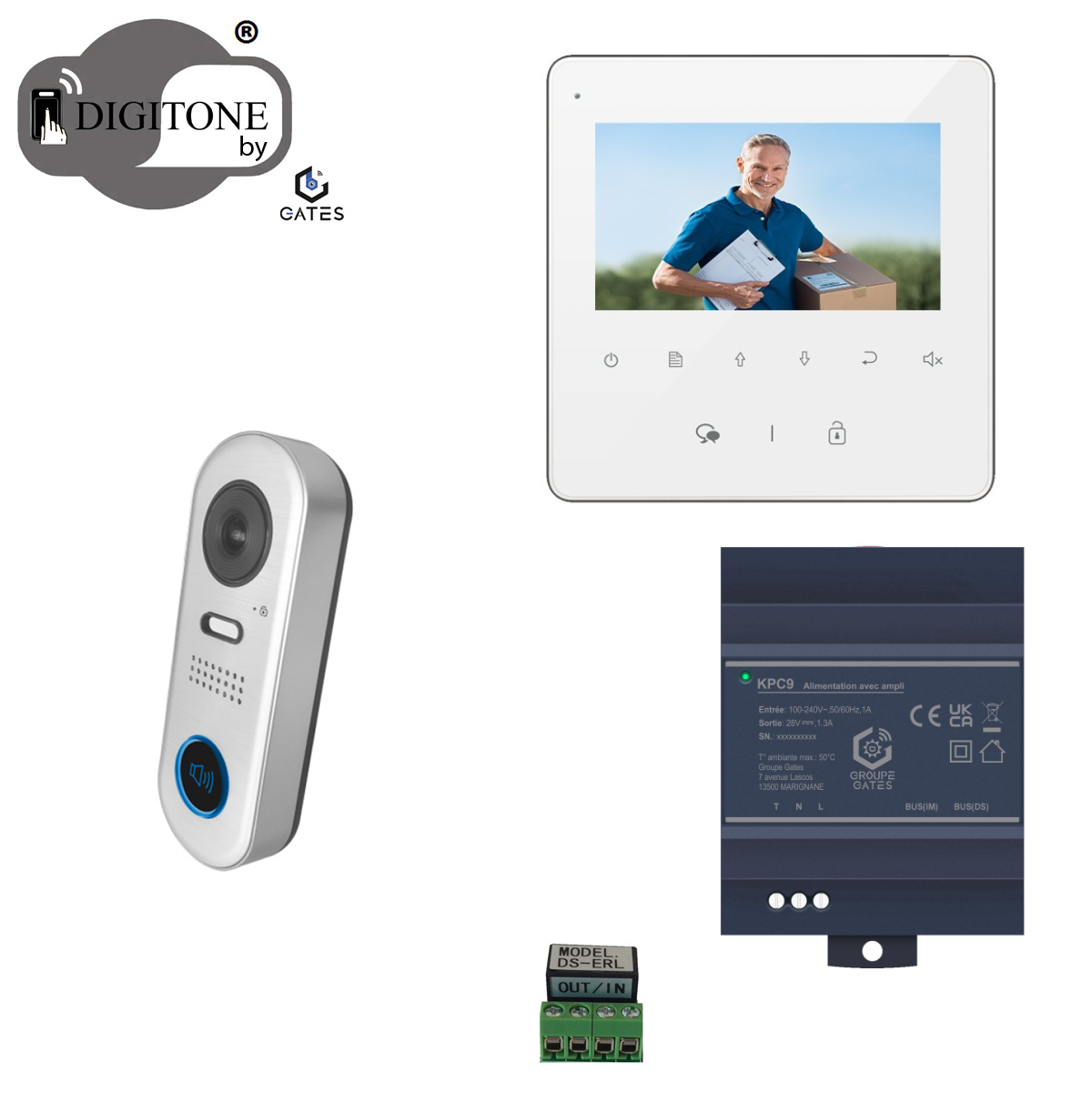 Ce portier vidéo Digitone vous permet de répondre au visiteur qui se présente depuis le moniteur vidéo intérieur. La commande de gâche électrique ou d'automatisme de portail/porte de garage intégrée, permet d'ouvrir depuis ce même moniteur un portillon ou un portail.