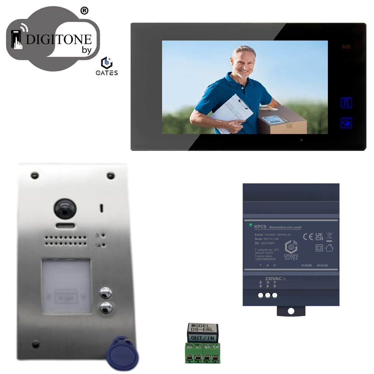Ce portier vidéo 7 pouces Digitone vous permet de répondre au visiteur qui se présente depuis le moniteur vidéo intérieur. La commande de gâche électrique ou d'automatisme de portail/porte de garage intégrée, permet d'ouvrir depuis ce même moniteur un portillon ou un portail.