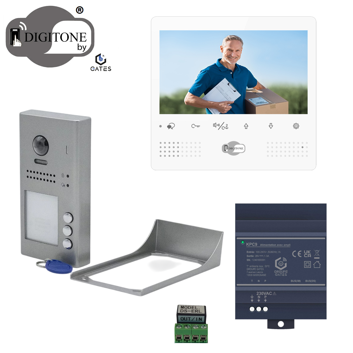 Ce portier vidéo 7 pouces Digitone vous permet de répondre au visiteur qui se présente depuis le moniteur vidéo intérieur. La commande de gâche électrique ou d'automatisme de portail/porte de garage intégrée, permet d'ouvrir depuis ce même moniteur un portillon ou un portail.