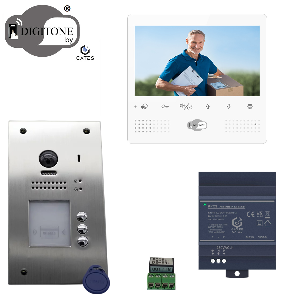 Ce portier vidéo 7 pouces Digitone vous permet de répondre au visiteur qui se présente depuis le moniteur vidéo intérieur. La commande de gâche électrique ou d'automatisme de portail/porte de garage intégrée, permet d'ouvrir depuis ce même moniteur un portillon ou un portail.